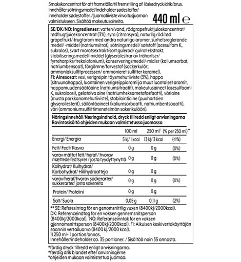 Pullo sisältää 440 ml, josta saadaan noin 9 litraa valmista juomaa. Säilytä kuivassa ja viileässä paikassa, avattuna jääkaapissa. Ravistettava ennen käyttöä.
