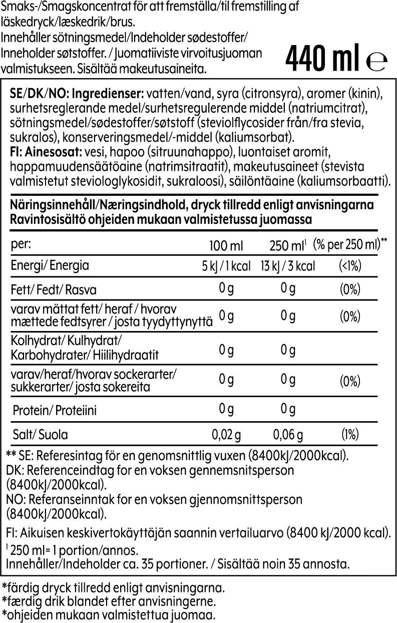 Pullo sisältää 440 ml, josta saadaan noin 9 litraa valmista juomaa.